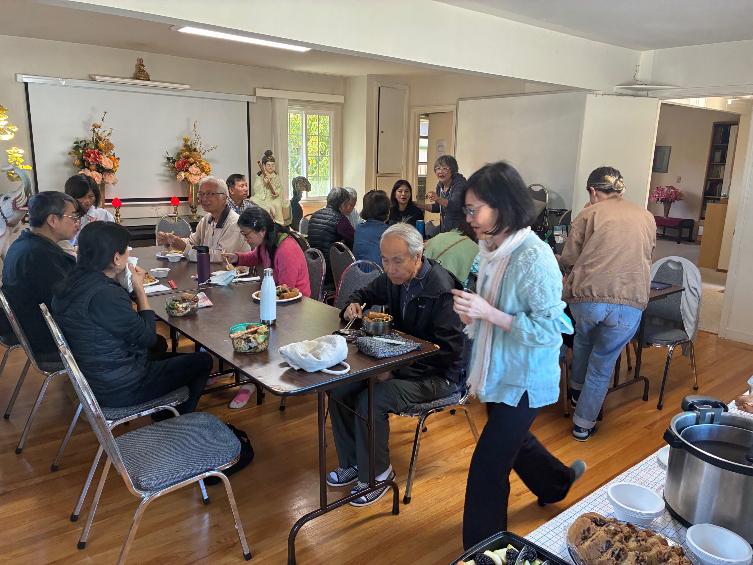 法談告一段落,師兄姊熱誠、暖心的供僧佳餚便排滿整個長桌,長到要用紙箱延長桌面,史所僅見,可想見軍容之壯盛:脆酥酥的春捲、香氣四溢的麻醬拌麵、紫米飯、自製蔓越橘莓開心果麵包、熱氣滾滾的豆腐煲、彩椒煎豆腐、滷味拼盤、充滿創意的梅菜扣豆腐、素黃雀、清雅的蓮藕木耳什蔬、比日月潭阿婆茶葉蛋更勝一籌的茶葉蛋、飄著仙氣的松子合掌瓜湯、秋季養生的紅棗銀耳湯、甜滋滋蛋糕、月餅、當季的蓮霧、龍眼、紅棗、各色葡萄、黑莓、蘋果、軟棗獼猴桃…。法中兄弟姊妹親切聚聊,每一顆心都搭起一座橋。