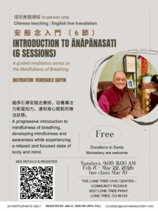 - 為了護念自己與他人,若您目前有 嚴重或未受控制的身心健康狀況(如嚴重高血壓、糖尿病、心臟病、嚴重憂鬱症),建議暫緩報名,待身心穩定後再參加課程。For your safety and the well-being of others, if you have serious or uncontrolled physical or mental health conditions (e.g., severe hypertension, diabetes, heart disease, major depression), please postpone registration until your condition is stable.