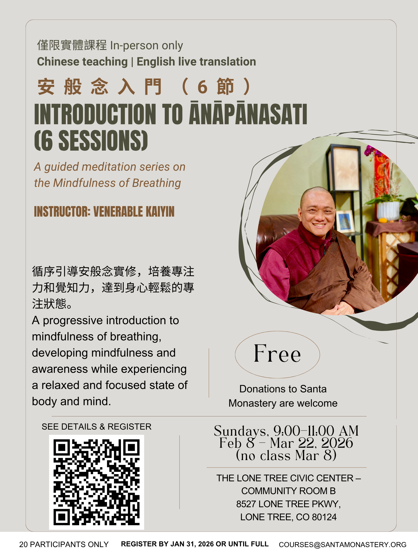 中文: 上課地點已更新,請前往寂靜禪舍參加課程。